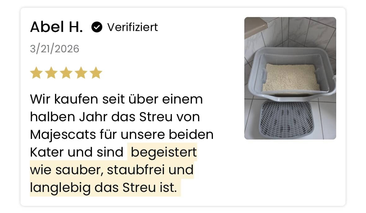 Im Monatsvergleich mit den anderen Produkten in diesem Test landet Majescats trotz höherem Packungspreis auf einem ähnlichen Niveau. Der Unterschied: Für denselben Betrag bekommst du hier keinen Kompromiss, sondern 30 Tage ohne Staub, ohne Streu im Flur und ohne den unangenehmen Gedanken, wenn es an der Tür klingelt. Und die Gewissheit, dass deine Katze täglich saubere Luft atmet.
