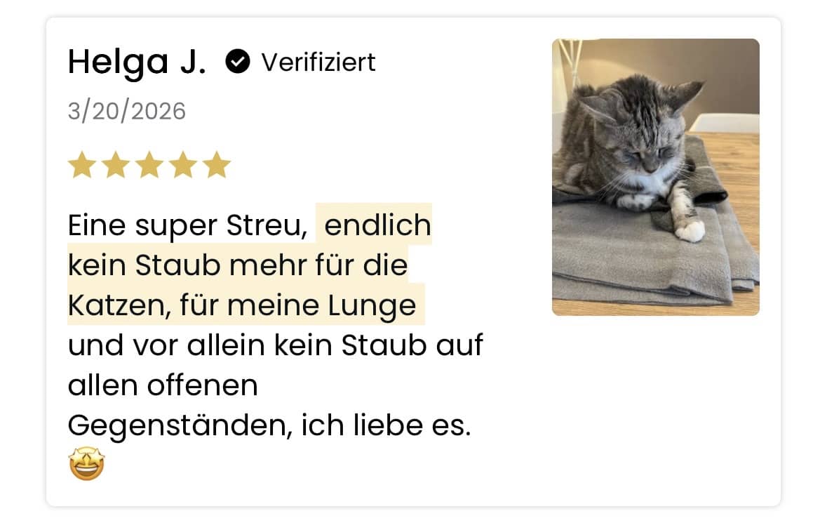 „Endlich verlässt Mimi ihr Klo, ohne zu niesen. Ich fülle nach, keine Staubwolke. Wenn es klingelt, denke ich nicht mehr ans Klo. Ich hatte nicht gedacht, dass ein Streu so einen Unterschied machen kann." – Claudia S., Katzenbesitzerin seit 8 Jahren